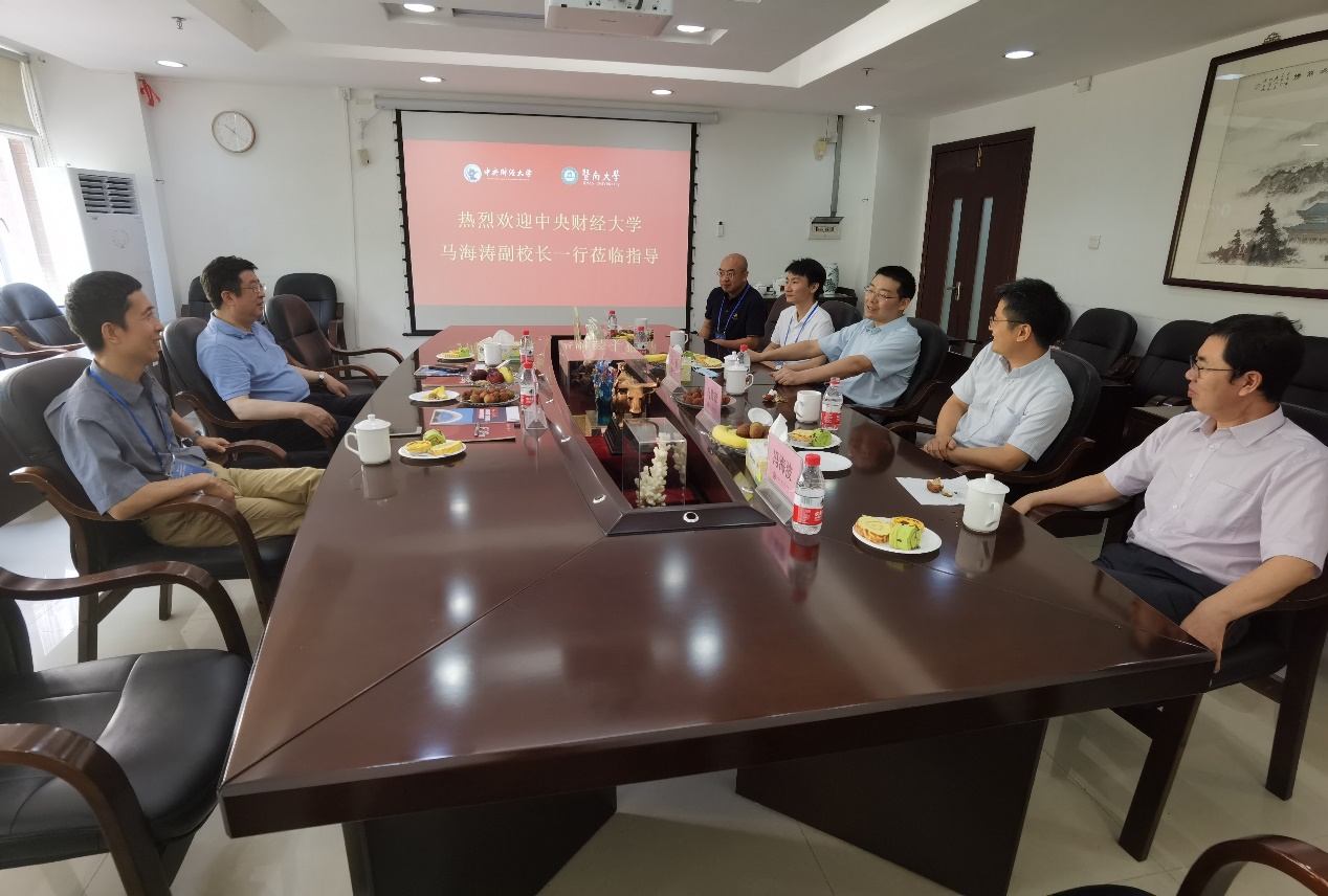 5月22日上午,中央财经大学副校长马海涛、财政税务学院院长白彦锋一行到访beat365英国官方网站。beat365英国官方网站副校长王兵、beat365英国官方网站院长冯帅章、副院长郑贤、财税系主任冯海波、财税系原系主任沈肇章与来宾进行座谈交流。