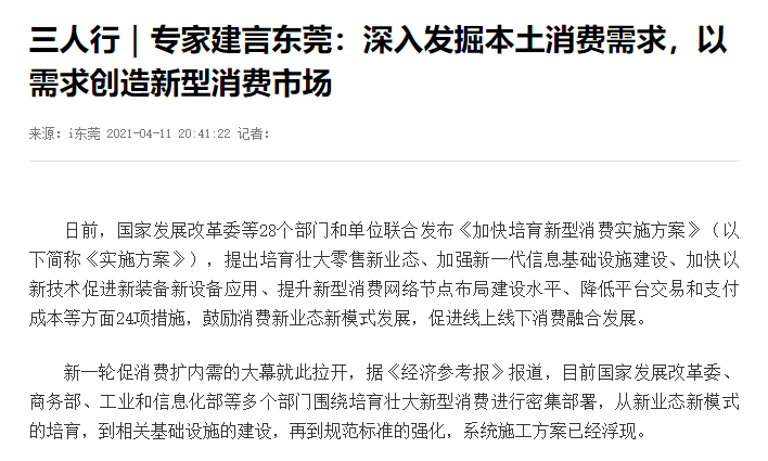 记者:地方培育新型消费需要根据当地消费供给能力与层次、信息基础设施建设情况、公共服务供给能力等进行,在您看来,东莞应当如何发挥本土优势的同时补足短板,因地制宜地培育与发展新型消费?