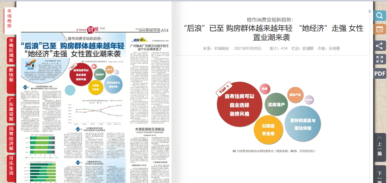 “家财万贯,一日不过三餐。广厦万间,夜眠仅需七尺。” 房子作为许多消费者一生最大的投资品,常常成为坊间茶余饭后讨论的话题。而随着中国住宅地产业进入提质换挡、减速运行的新常态,购房者群体也从群体特征、买房需求到信息获取渠道上有了不同的变化。羊城晚报记者梳理行业相关数据报告发现,楼市消费开始呈现购房群体年轻化、女性购房者增多、消费需求多元化推动房企数字化等不少新趋势。