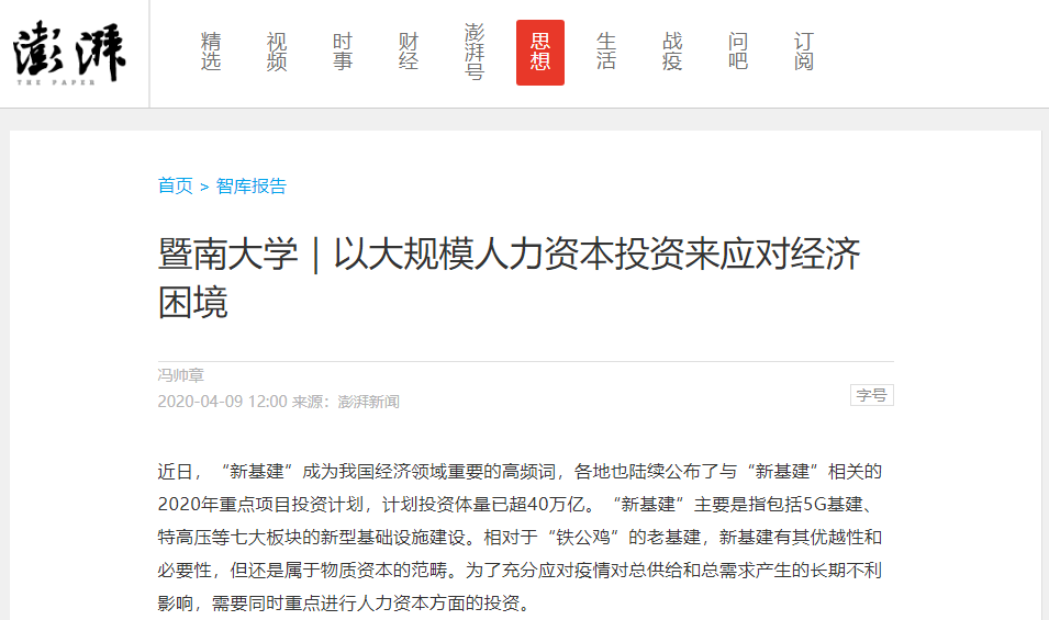然而仅仅投资于“新基建”为代表的物质资本,可能很难避免当年“四万亿”所带来的一些不利影响。正确的做法应该是在“物”与“人”之间寻求一种平衡,既投资于物,也投资于“人”。