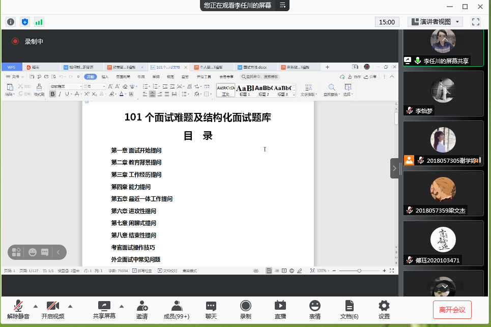 李任川对“无领导小组面试”的应对也作了详细讲解,对群面的角色如领导者、破冰者、组织者、时间控制者、总结者等一一进行了说明。他指出,群面中面试者需积极参与讨论,展示特长,体现在团队中的价值等。此外,李任川还就制作个人简历、自我介绍、面试着装等内容进行了介绍,举例分析说明求职者应如何在个人简历中凸显个人优点,并分享了求职面试优秀模板。