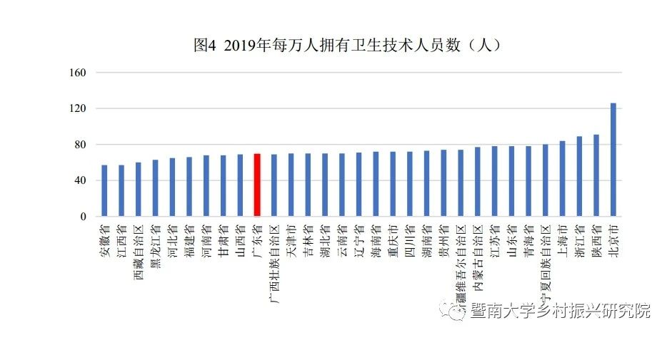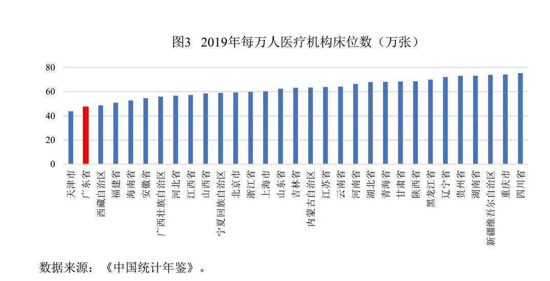 相比较而言,广东省的医疗资源供给不充分,医养结合更能适应养老服务发展需求。一方面,与全国其他省份相比,广东省基础医疗资源在全国处于较低水平。2019年,每万人医疗机构床位数,广东为47张/万人,位于全国倒数第二;每万人拥有卫生技术人员数69人/万人,低于全国平均水平。广东省不仅基础医疗资源缺乏,且正式医疗机构负荷重。2019年,医疗卫生机构诊疗人次8.92亿次,为全国提供诊疗次数最多的省份;入院人数1816万人,达到全国第四位。