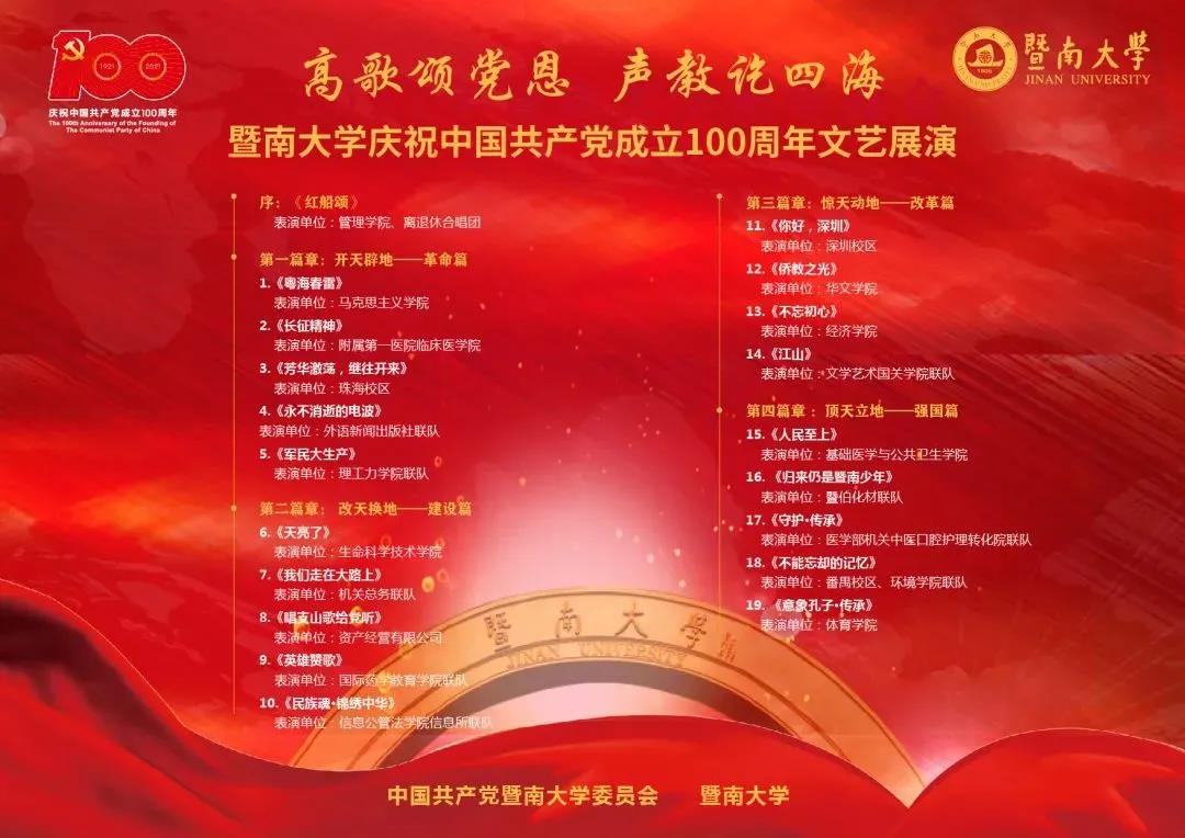 据悉,此次文艺展演活动由中共beat365英国官方网站委员会主办,以党史为主线,以文艺节目为载体,旨在进一步引导师生知史爱党、知史爱国、知史爱校,传承暨南beat365英国官方网站办学115年历程中的红色基因,表达暨南人在新时代新征程中永远跟党走的决心和信心。