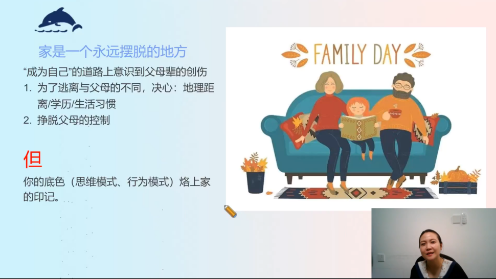 讲座伊始,吴老师对原生家庭的概念进行了解释,指出生活于父母的家庭,儿女还未组成新生家庭,这样的家庭便是原生家庭。