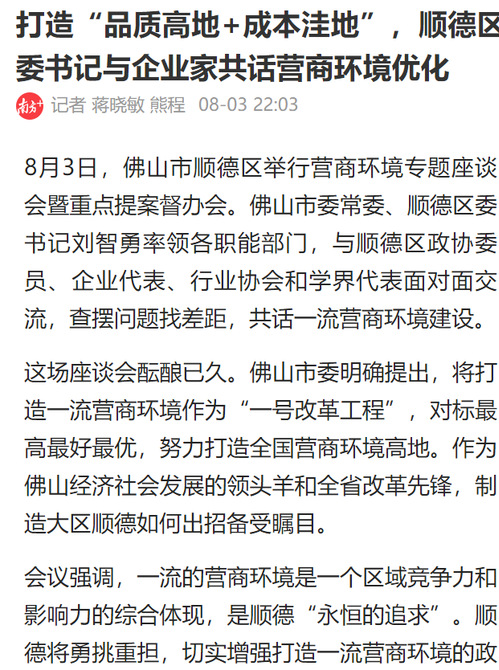 这场座谈会酝酿已久。佛山市委明确提出,将打造一流营商环境作为“一号改革工程”,对标最高最好最优,努力打造全国营商环境高地。作为佛山经济社会发展的领头羊和全省改革先锋,制造大区顺德如何出招备受瞩目。