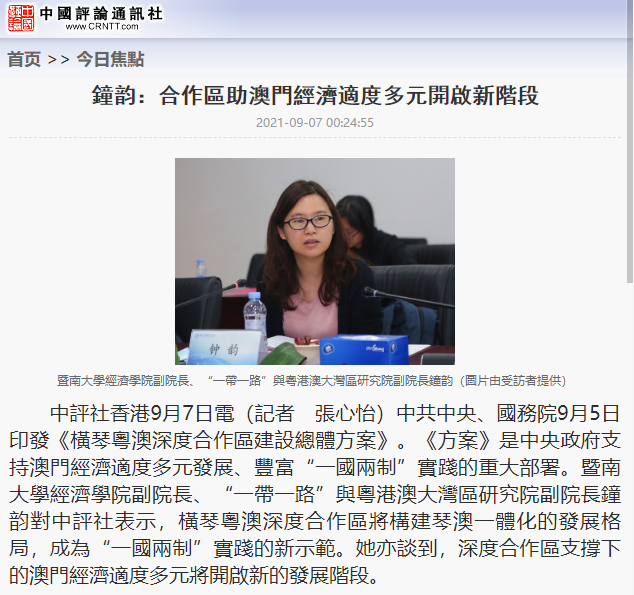 中评社香港9月7日电(记者 张心怡)中共中央、国务院9月5日印发《横琴粤澳深度合作区建设总体方案》。《方案》是中央政府支持澳门经济适度多元发展、丰富“一国两制”实践的重大部署。beat365英国官方网站副院长、“一带一路”与粤港澳大湾区研究院副院长钟韵对中评社表示,横琴粤澳深度合作区将构建琴澳一体化的发展格局,成为“一国两制”实践的新示范。她亦谈到,深度合作区支撑下的澳门经济适度多元将开启新的发展阶段。