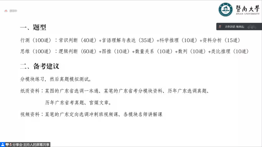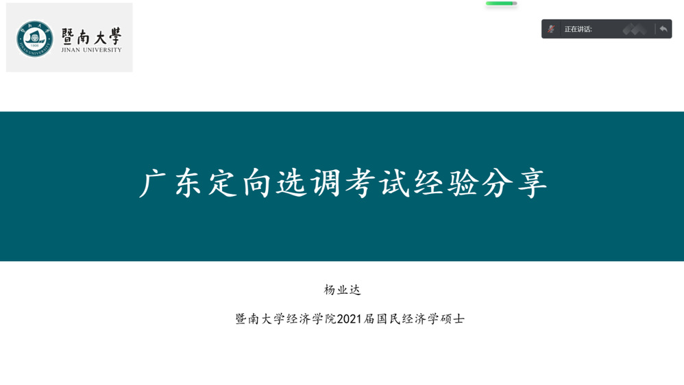 杨业达,2021届国民经济学硕士研究生,现就职于中共南澳县委统战部。他从“为什么选择考公务员?”“国考、定向选调、省考的区别”“职位选择问题”三个方面,向同学介绍公务员考试基本情况以及如何选择岗位。他重点分享自己报考广东定向选调的笔试和面试经验。笔试方面,他建议分模块练习,加真题模拟测试;面试方面,他建议报班练习,进行系统性培训。最后,他推荐同学们关注“共产党员网”各地组织部发布的文章,留意金句和小标题,学会总结归纳并用于自身答题。