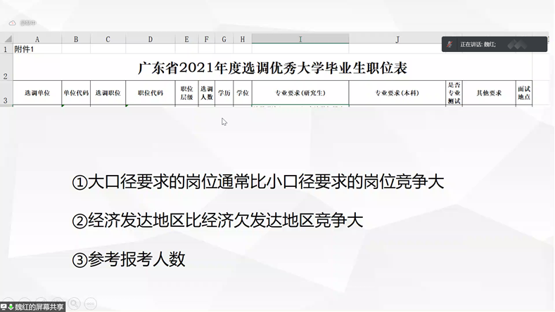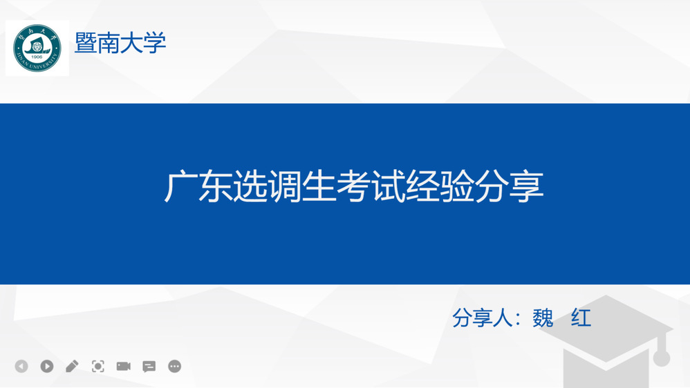 魏红,2021届统计学硕士研究生,参加2021广东省选调生,现就职于中山市乡镇。她从个人择业角度,建议大家在报考公务员时,先定一个主要目标,做多手准备,接着分享广东选调生的报考流程、选调对象和高校范围、以及选调条件。对于选调生的备考经验,她建议在笔试方面,先分模块学习,后利用真题进行练习,同时,她提到考后估分的重要性,要根据预期分数进行面试准备。在面试方面,她介绍无领导小组讨论的面试形式,建议报班培训、模拟练习,建立属于自己的答题思路与体系,同时提醒同学们平时多关注人民日报评论、新闻1+1、粤讲粤政,进行新闻时事的积累,锻炼自身分析问题的能力。
