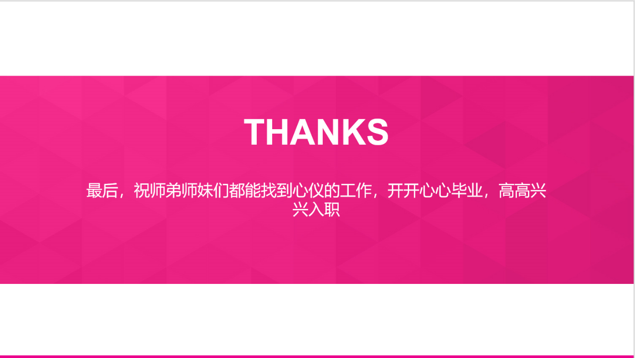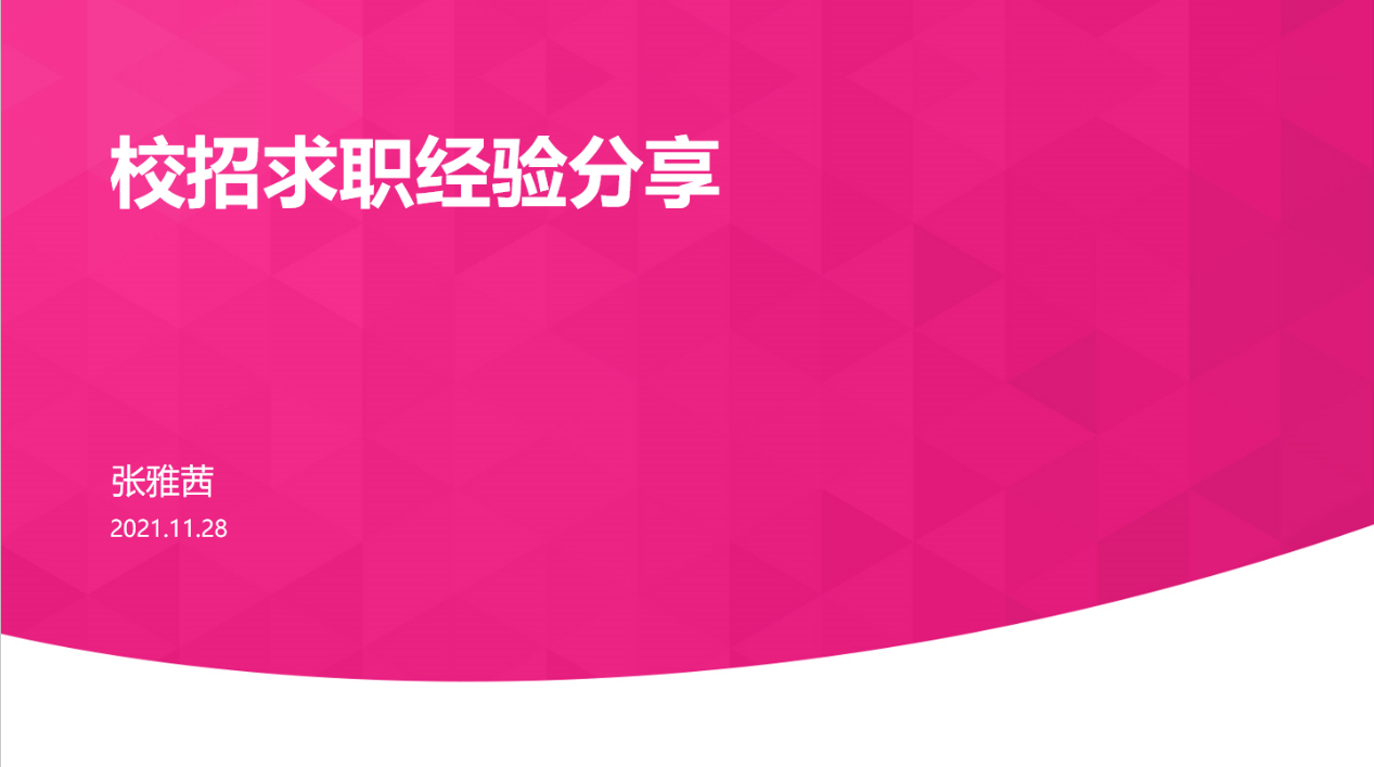 2021届统计学硕士研究生张雅茜首先向同学们介绍自己的面试经历。她建议同学们积极抓住秋招的机会,积累经验,争取秋招的时候就拿到offer。同时,她向同学们介绍了简历制作、投递的相关技巧;面试、笔试的相关经验;薪酬、福利的相关情况,以及在互联网和国企之间该如何抉择。最后,她祝愿同学们都能找到心仪的工作,开心入职。