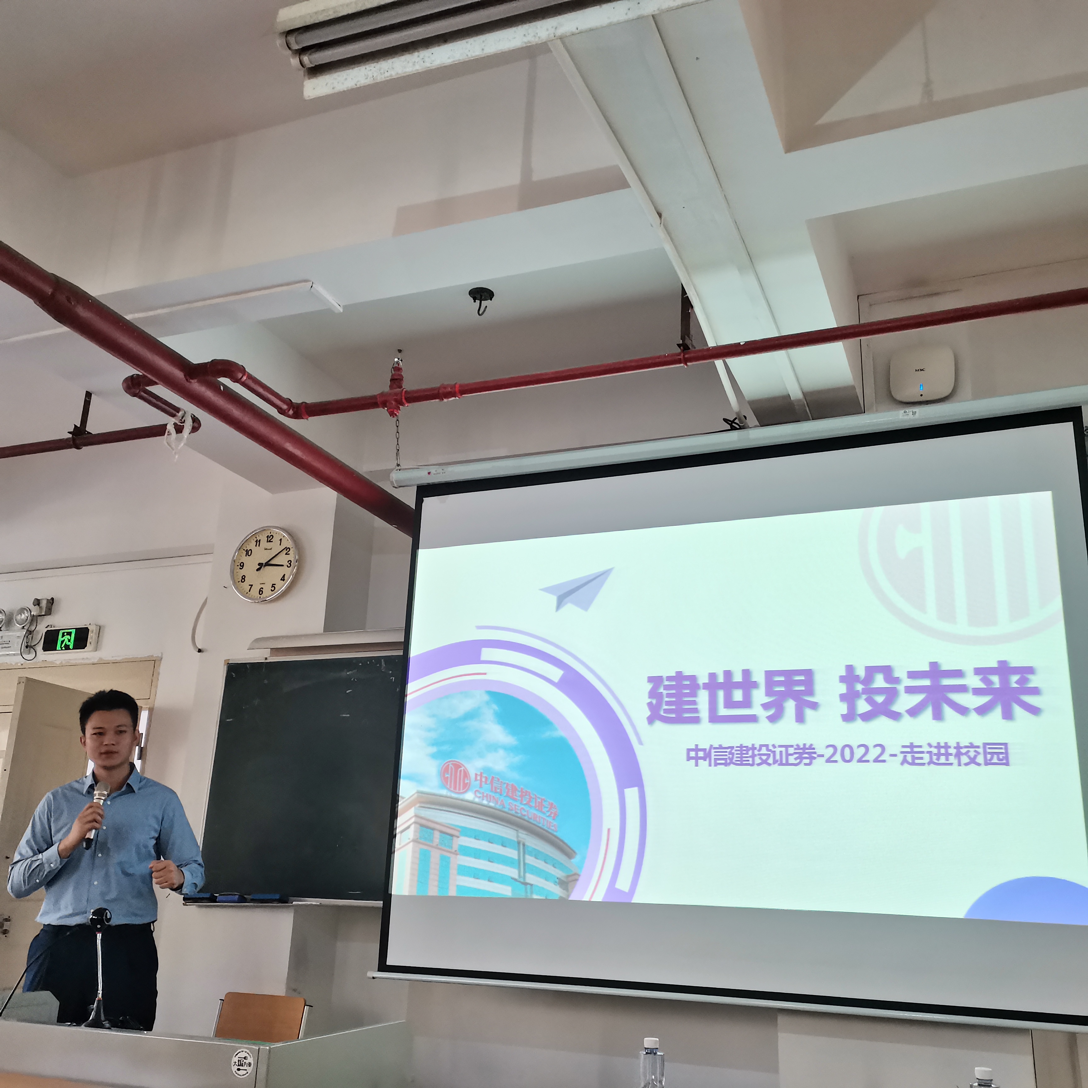 11月26日,以券商从业为主题的“求学求职经验朋辈分享会”在华文校区一教215室举行。分享会上,现就职于中信建投证券股份有限公司的校友洪杰鹏向大家分享了个人的校园及工作经历,及券商从业的相关知识,为同学们答疑解惑,并为同学们的职业生涯规划提供了建设性意见。