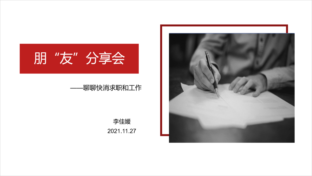 2021届国际贸易学硕士研究生李佳媛首先介绍了自己的基本情况,分享了自己的秋招经历。她分享了秋招的经验技巧,并向同学们详细介绍了市场部工作的相关内容,并给出了择业的相关建议。最后,她寄语同学们在求职过程中,做好自己,从容面对,不舍热爱。