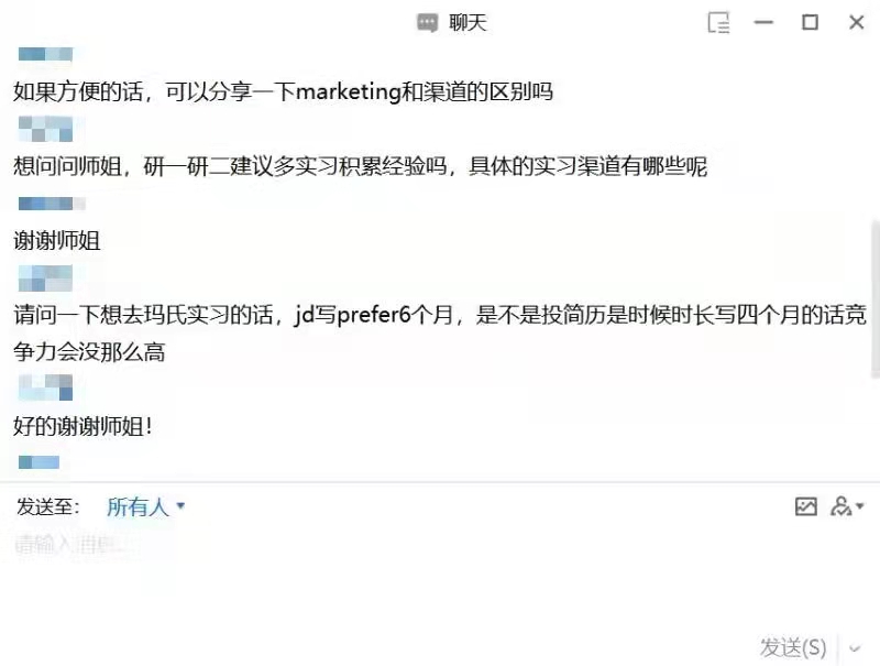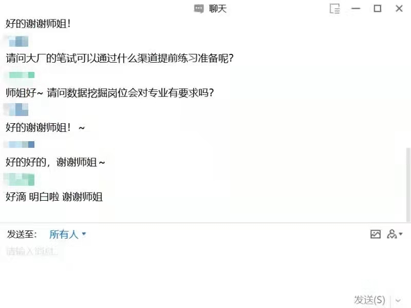 经验分享结束后,同学们就实习渠道、大厂笔试等方面的问题积极提问。两位校友也结合自身的实际情况热心解答同学们的相关疑问。