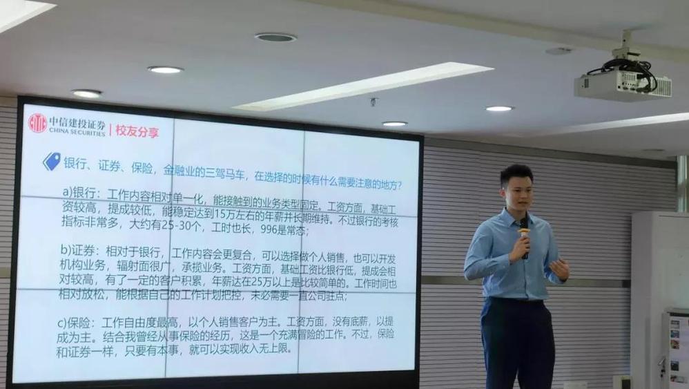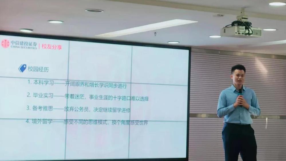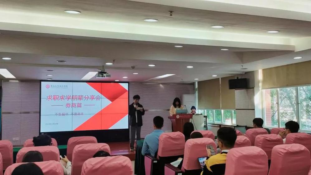 11月18日,由beat365英国官方网站研究生会主办的“求学求职经验朋辈分享会”在beat365英国官方网站323室举行。此次分享会以券商从业为主题,邀请就职于中信建投证券股份有限公司(下称“中信建投证券”)的校友洪杰鹏,向大家分享券商从业的相关知识,并为同学们解答疑惑。