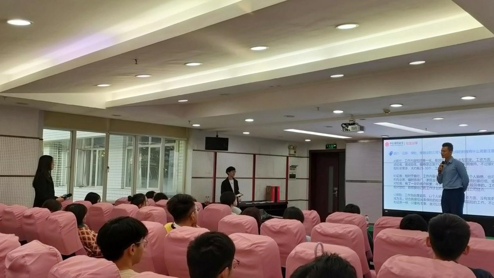 洪杰鹏详细地介绍了当前就职的公司——中信建投证券,藉此让同学们更深入地了解从业环境。包括介绍中信建投证券三大主营业务:投资银行业务、经纪业务及机构业务。他建议在校的同学不仅要认真做好学业规划,还要争取通过CPA、CFA、司法考试等资格考试,提升个人在金融行业的竞争力。