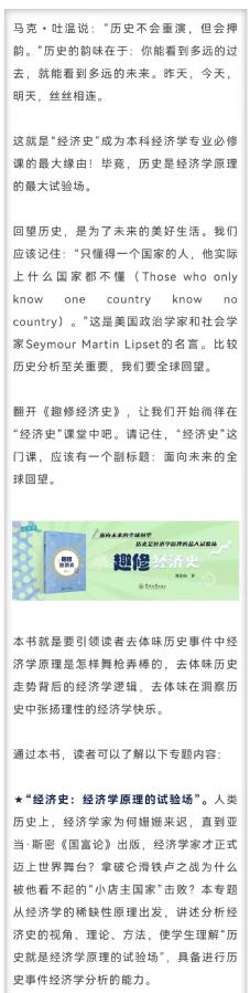 本书是“趣修经济学丛书”之一,结合经济学原理,用轻松活泼的语言阐述了经济史的演进逻辑与规律,以中国经济史为重心,兼顾世界经济史的比较分析,以大事件和专题形式,使学生了解历史演进的特征与趋势,能够洞察重大历史事件的经济学逻辑和微观个体行为选择的动因,并掌握分析经济史演进的理论与方法。全书共七章,包括:绪论,第一章“经济史:经济学原理的试验场”,第二章“人地关系:马尔萨斯陷阱与传统经济”,第三章“盛衰之间:李约瑟之谜与东西方大分岔”,第四章“经济奇迹:中国之治与经济体制比较”,第五章“经济大循环:中国与美国的演进路径” ,第六章“向湾而生:陆海互动的历史与未来”。本书知识性与可读性俱佳。