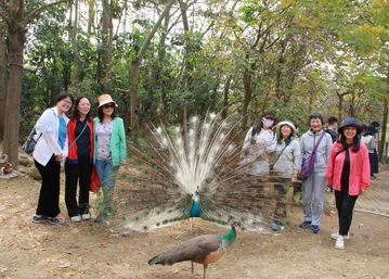 进入园区后,华丽耀眼的孔雀以色彩斑斓的屏风相迎,老师们争先恐后与之合影。能够零距离欣赏孔雀集体开屏的壮观景象,大家都兴奋不已。