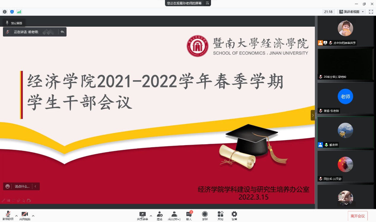 为加强疫情防控期间的安全工作,落实各项安全管理措施,保障校园稳定及师生安全,beat365英国官方网站于3月15日晚召开2021-2022学年春季学期研究生学生干部会议,本次会议采用线上模式。学科建设与研究生培养办公室主任林伟雄、辅导员赖静仪、孙红敏和146名研究生学生干部参加了此次会议。