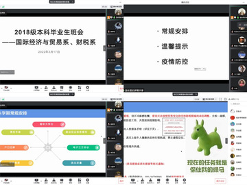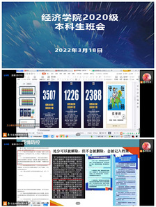 为贯彻落实beat365英国官方网站2022年春季学期学生工作部署会和学校疫情防控会议的精神,教育引导广大学生提高站位,绷紧疫情防控这根弦,开学以来,按照学院安排,beat365英国官方网站本科生各班级组织召开“线上+线下”班会16场,向同学们进一步传达了《关于提升校园疫情防控级别的通知》及学校各项防疫管理安排,并开展学业分析、防诈骗教育、学习新版违纪处分办法等内容。各系党总支书记、辅导员参加会议,共计1600余名学生参会。