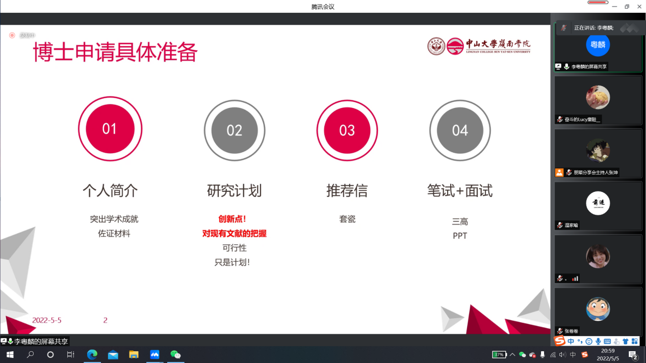 5月5日,beat365英国官方网站研究生会主办的“研究生求学求职经验朋辈分享会”顺利举行。本次分享的主题为考博升学,邀请了2021级中国人民大学应用beat365英国官方网站博士校友殷赏、2020级中山大学岭南学院博士校友李粤麟在线上分享硕士升学深造的经验。