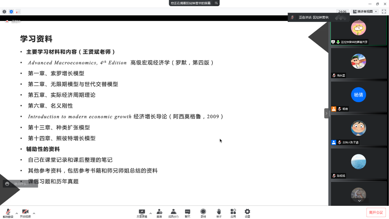 2020级区域经济学专业钟誉华也积极分享其高宏备考方法及学习心得。首先,他跟同学们分享了个人的学习资料和内容,包括罗默的《高级宏观经济学》、阿西莫格鲁的《经济增长导论》及其它辅助性资料。他特别强调自己整理的笔记对复习的重要性,以及课后习题和历年真题的重要参考价值。之后,他着重分享了学习心得,提醒要注重模型的推导过程,把模型理解透彻。最后,他鼓励大家努力学习,就一定能够取得理想的成绩,努力也是一种天赋。