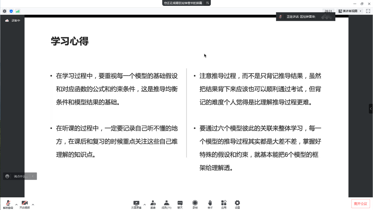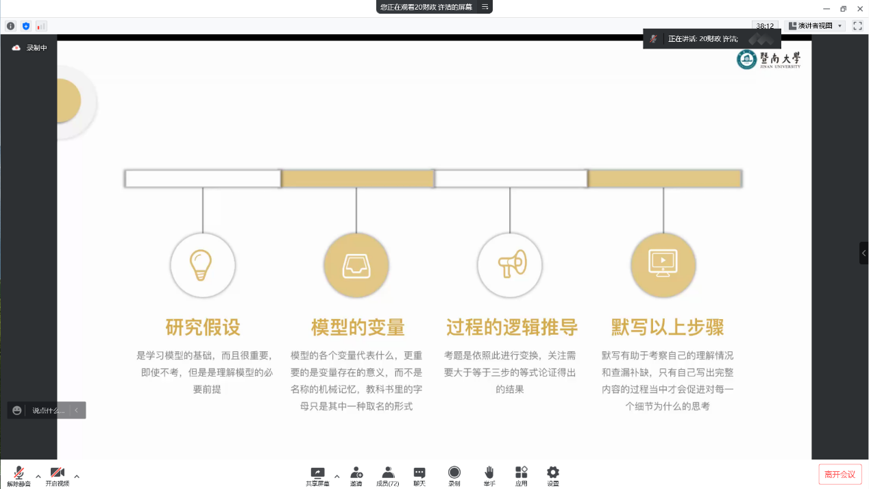 2020级财政学专业许洁结合自身经历分享学习高宏的经验。她在刚开始学习高宏的时候,也有困惑和不懂的地方,有时候甚至跟不上老师上课的进度,但她没有气馁。通过课后和同学们探讨高宏问题,并结合学习方法,她成功在高宏期末考试的时候取得了好成绩。她勉励同学们,要对自己有信心,只要注重方法,高宏还是不难的。之后她从研究假设、模型的变量、过程的逻辑推导、默写以上步骤四个过程来具体分享其学习方法。