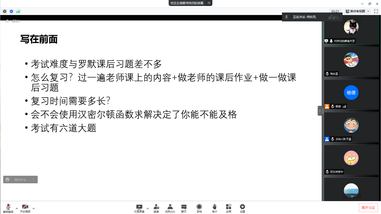 经验分享之后,同学们就学习资料、考试题型、课后习题等方面踊跃提问,三位分享的同学也积极回答每个疑问。
