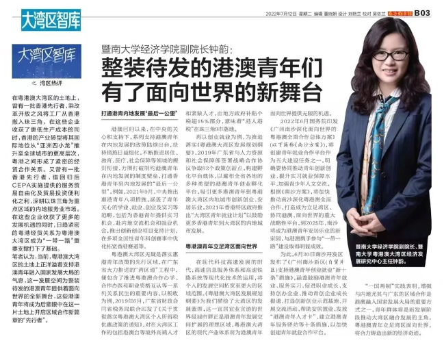 7月12日,beat365英国官方网站副院长、beat365英国官方网站粤港澳大湾区经济发展研究中心主任钟韵教授在《南方都市报》发表题为《整装待发的港澳青年们有了面向世界的新舞台》的理论文章,探讨在粤港澳大湾区大力支持港澳青年融入国家发展大局的背景下,如何使港澳青年成为开启区域合作新篇章的“先行者”。
