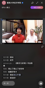 节目表演结束后,主持人分别与统计系1985级校友黄建中以及节目表演者进行连线。黄建中讲述了国际金融系1981级校友朱川倡导并推动教师节设立的感人事迹,以及自己在朱川师兄的感召下组建暨南骑行社,并率“铁骑”赴京倡议提高交通安全宣传力度的个人经历。多位往届校友则齐聚一堂,共忆经院青葱时光,对学院与老师的辛勤培育表示感谢,并向大家致以双节问候。