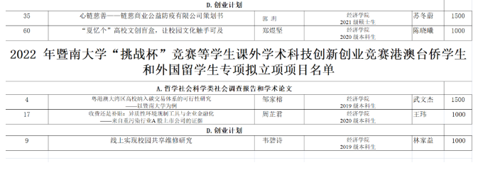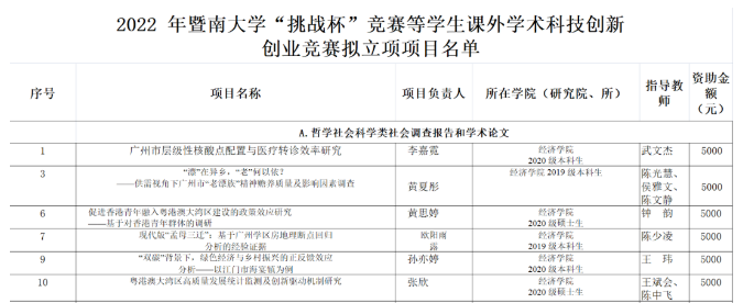 9月16日,学校团委公布了2022年beat365英国官方网站“挑战杯”竞赛等学生课外学术科技创新创业竞赛(以下简称“挑战杯”)拟立项项目公示名单。beat365英国官方网站学生共获批立项40项,总资助金额79500元,立项数量排名全校第一!其中,本科生获立项24项、硕士生获立项13项,港澳台侨学生和外国留学生专项3项。