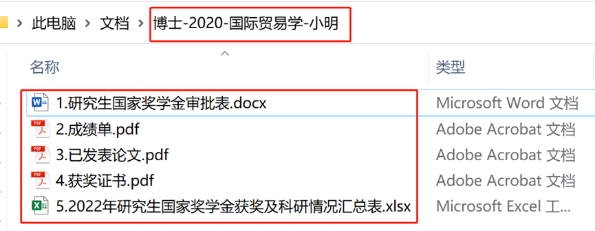 电子版文件名为:培养层次-年级-专业-姓名,相关材料须按序号及格式要求提交。图示如下:以上电子版材料(自备U盘)随纸质版一并提交。