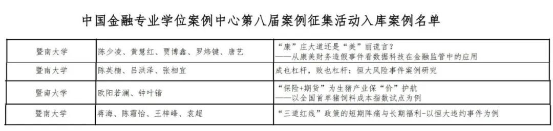 其中,陈少凌老师团队作品《“康”庄大道还是“美”丽谎言?——从康美财务造假事件看数据科技在金融监管中的应用》(其他作者:黄慧红、贾博鑫、罗炜键、唐艺)、陈英楠老师团队作品《成也杠杆,败也杠杆:恒大风险事件案例研究》(其他作者:吕洪泽、张相宜)、欧阳若澜老师团队作品《“保险+期货”为生猪产业保“价”护航——以全国首单猪饲料成本指数试点为例》(其他作者:钟叶锴)和蒋海老师团队作品《“三道红线”政策的短期阵痛与长期福利——以恒大违约事件为例》(其他作者:陈霜怡、王梓峰、袁超)从1058篇案例中脱颖而出,入选第八届中国金融专业学位优秀入库案例。
