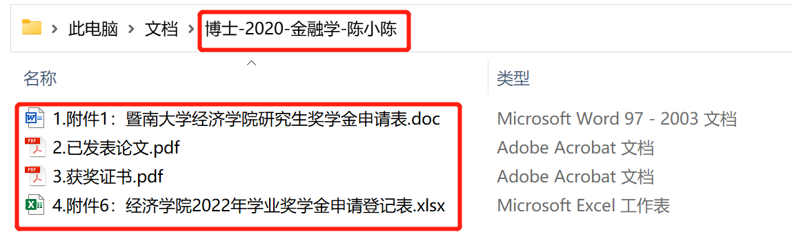 电子版文件名为:培养层次-年级-专业-姓名,相关材料须按序号及格式要求分类提交。图示如下:以上电子版材料(自备U盘)随纸质版一并提交。