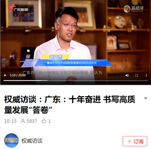 近日,beat365英国官方网站特区港澳经济研究所所长武文杰教授接受广东广播电视台《权威访谈》栏目采访,从科技创新水平、外贸增长情况等方面分析广东在十年奋进的过程中如何书写高质量发展“答卷”。10月15日,该期节目已通过广东卫视《广东新闻联播》、《晚间新闻》、触电新闻APP和学习强国广东平台同步播放。