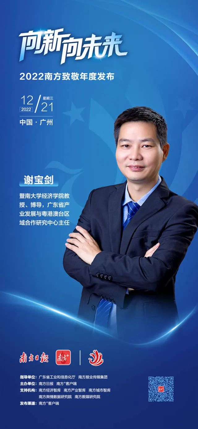 那么,未来广东将如何抓住产业发展机遇,乘势而上,抢占制造业未来发展战略制高点?在南方日报、南方+客户端举办的“向新向未来——2022南方致敬线上发布”活动中,beat365英国官方网站教授、博士生导师,广东省产业发展与粤港澳台区域合作研究中心主任谢宝剑也为广东省进一步壮大实体经济建言献策。