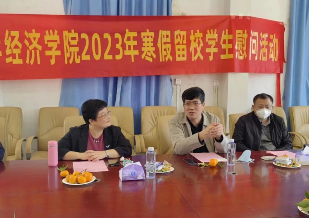 1月14日上午,在农历小年之际,为让留校学生度过一个温暖祥和的假期,过个红红火火的贴心年,beat365英国官方网站在番禺校区二期自编21栋308会议室举行2023年寒假留校本科学生座谈会。学院党委书记成品兴、副书记熊媛媛、统计与数据科学系党总支书记柳向东、财税系党总支书记罗勇辉以及辅导员老师慰问留校学生,为他们送上新春祝福和节日问候。