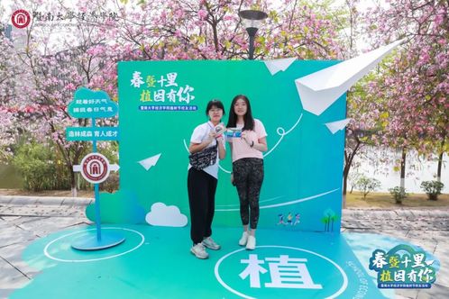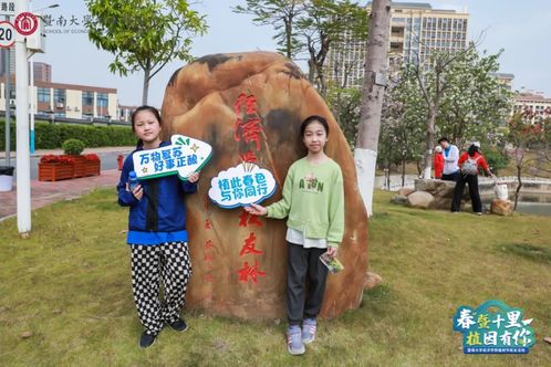 李白桃红,莺吟燕舞。“大家欣喜地凑近粉红的花树,享受着大自然的馈赠,沉醉于“弄花香满衣”的芬芳。赏心悦目的生态画卷。志愿者为校友们递上标语牌,校友和家属们手持标语牌,在半坡上、花树下、石碑旁打卡留念。