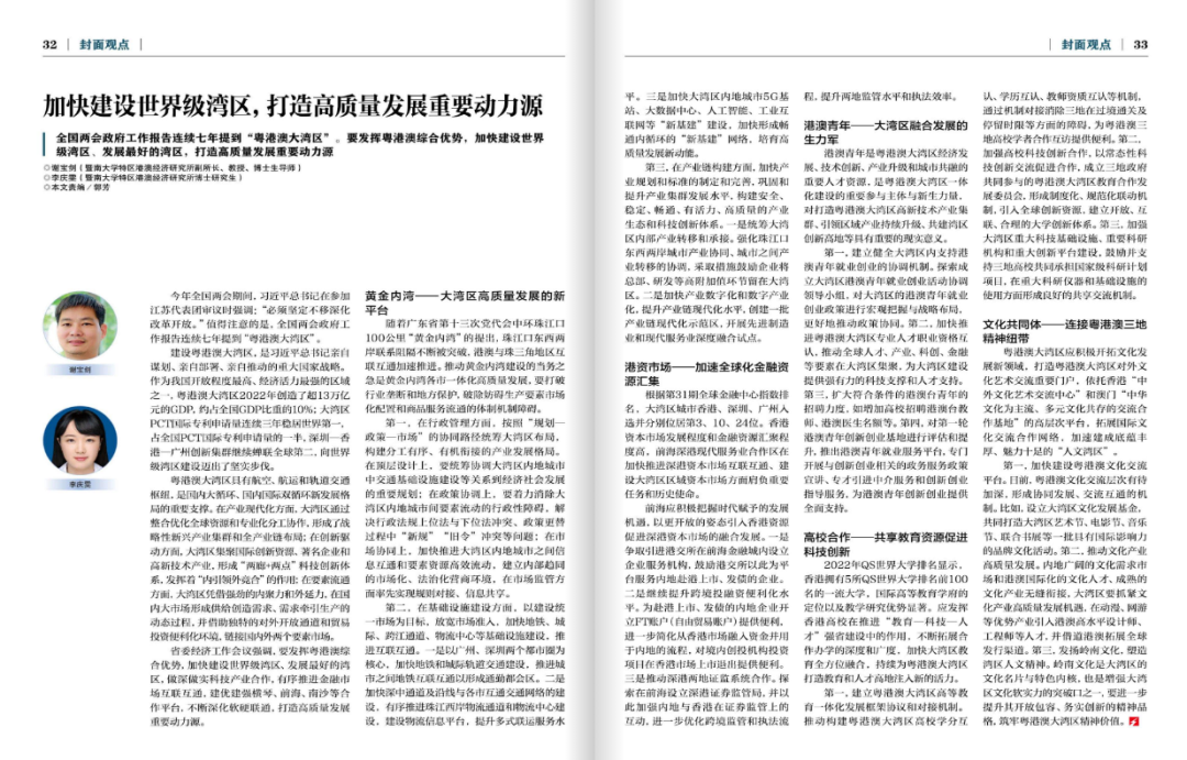 近日,beat365英国官方网站特区港澳经济研究所副所长谢宝剑教授与博士研究生李庆雯在《南方》杂志发表封面文章,聚焦粤港澳大湾区发挥综合优势、搭建大湾区高质量发展的新平台、吸引大湾区融合发展的生力军等问题,探讨如何加快建设世界级湾区,打造高质量发展重要动力源。