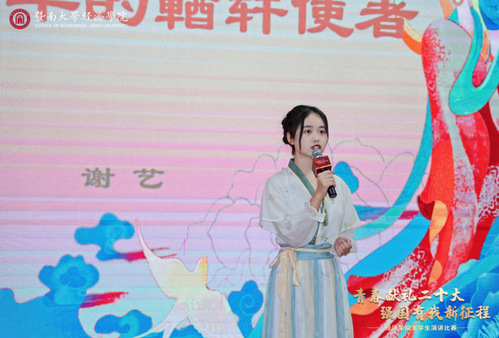 2022级经济统计学本科生谢艺动情讲述敦煌守护者樊锦诗的故事,勉励我辈不忘初心、牢记使命,希望新千年的“輶轩使者们”将文化自信的种子播撒在中华大地上。