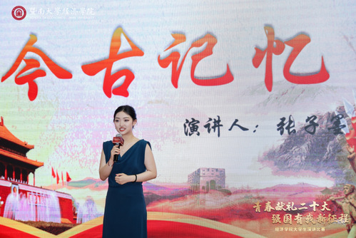 2022级财政学硕士研究生林裕欣以一位只有初中文化的、19 岁的战士写的一首诗开篇,希望生逢盛世的同学们忆苦思甜,铭记那些在最美年华为保卫祖国奉献生命的同胞们。同时呼吁各位时代接班人各司其职、铭记责任、造炬成阳,共同营造和平、美好、健康发展、积极向上的氛围。