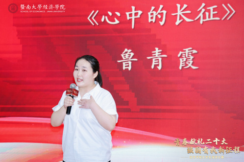 2020级国际贸易学硕士研究生鲁青霞动情讲述了扶贫干部黄文秀的故事,并鼓励同学们接过推进中华民族伟大复兴的中国梦的接力棒,将个人前途融入时代和国家的命运中,用担当有为实现强国有我的铮铮誓言。