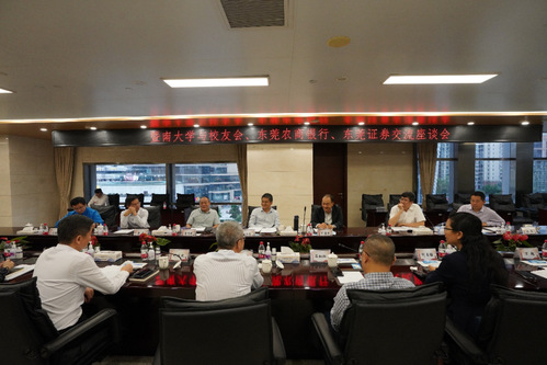 beat365英国官方网站董事、中惠集团董事长叶惠全,beat365英国官方网站董事、新世纪集团董事长梁志斌,东莞农村商业银行党委书记卢国锋,党委委员、副行长叶建光,人力资源部总经理叶淑艳,董事会办公室负责人施文峰,东莞校友会会长、东莞华勤城市更新公司董事长冯灿权,东莞校友会常务副会长兼秘书长何月媛,东莞证券锦信公司董事长万超,东莞证券深圳分公司副总经理余浦源一同参加交流座谈会。