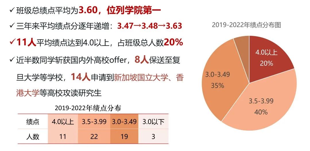 班级同学平均绩点逐年提升,从大一学年的3.47进步至大三的3.63,截至目前,总平均绩点全院第一,其中20%的同学平均绩点达4.0以上。