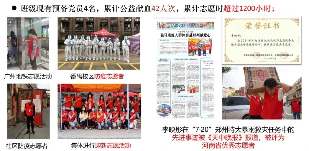 砥砺奉献,互帮互助。创立班级公众号,针对班级同学的阶段需求“量身定制”朋辈分享会;成立学习互助小组并建立学习资料分享群,累计分享文件383份;积极投身公益实践,参加校内核酸检测、新生引导、公益献血等志愿服务工作,全班累计志愿时长超过1200小时;与外招班委保持密切联系,促进内外招融合。