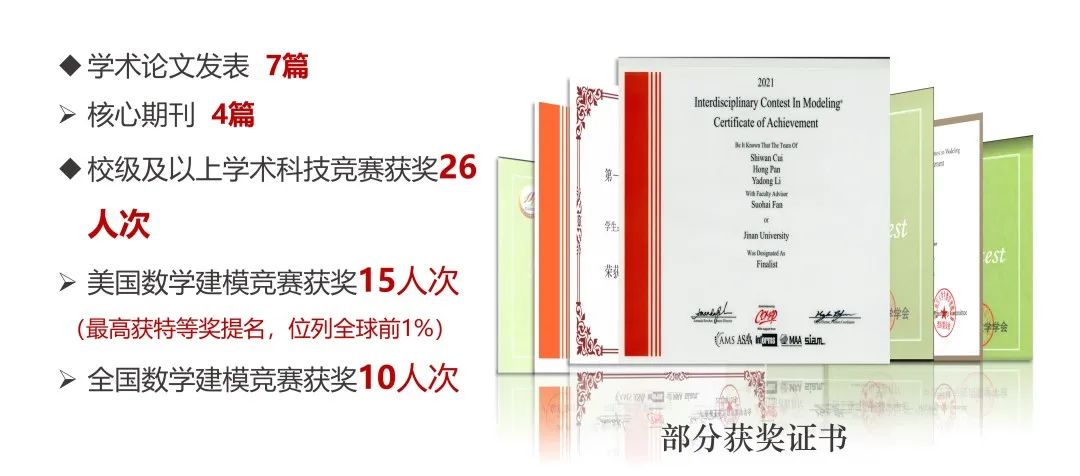 班级同学在科研学术、学科竞赛中放飞青春理想。全班累计发表学术论文7篇,在美国大学生数学建模、挑战杯等校级及以上学术科技竞赛中获奖26人次;班级成员主持或参与校级及以上本科生学术科研创新项目46人次,其中国家级项目10人次,省级项目9人次,申报项目涉及经济、金融、计算机、生物、化学等多领域。