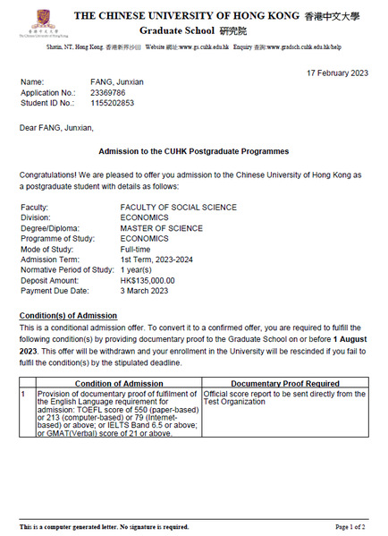 香港中文大学录取通知书