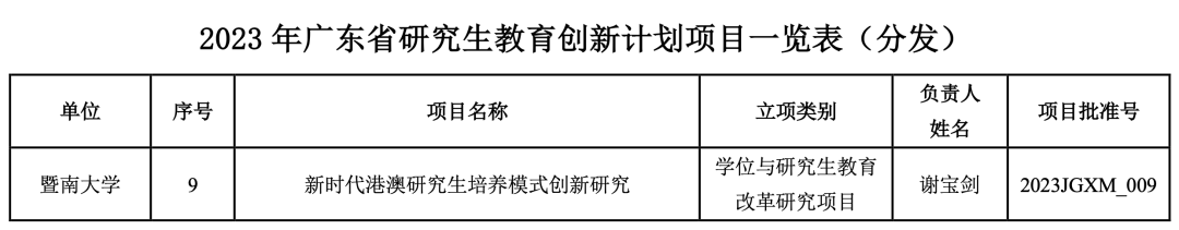 近日,广东省教育厅公布了2023年广东省研究生教育创新计划项目名单,beat365英国官方网站谢宝剑教授的项目——《新时代港澳研究生培养模式创新研究》(学位与研究生教育改革研究项目)成功入选。