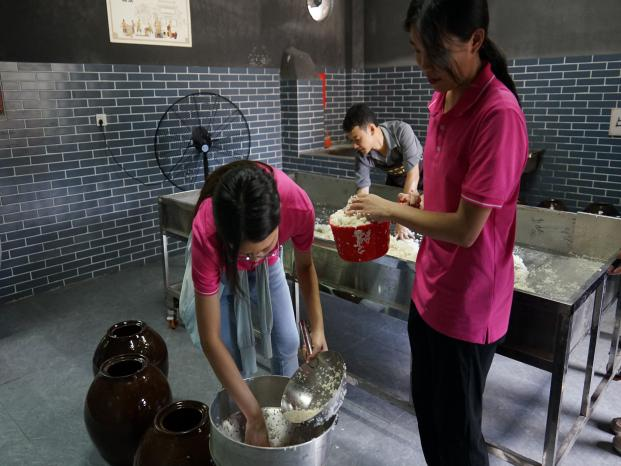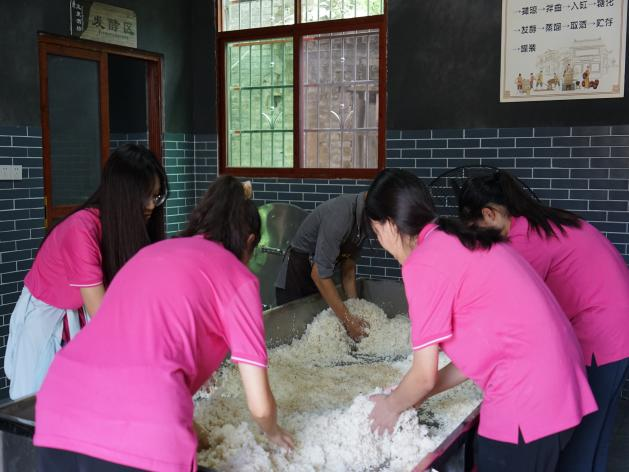 实践团在非遗传承人的带领下体验酿酒工艺