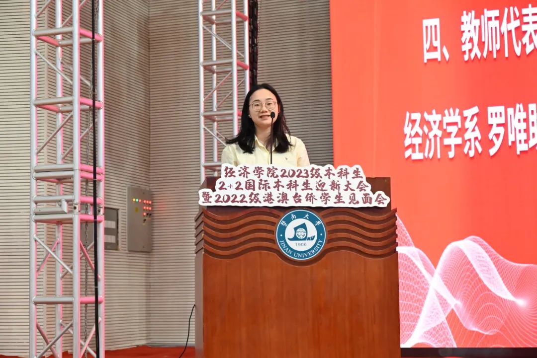 “大学,是自主的开始,是梦想的开始,是迈向崭新征程的见证。”来自经济学系的教师代表罗唯以自己从本科到博士11年的求学经历,向各位同学分享了几点大学建议:一是尽快适应角色转变,适应大学生活,学会尊重与包容;二是珍惜时光,刻苦学习,充分利用学校丰富的教育教学资源,珍惜转瞬即逝的大学时光,敢于碰硬、主动探索;三是重视实践,走进社会,积极参加社会实践、科研项目和志愿活动。“大学生活不仅是学业的竞逐,更是人生价值观的铸造。”她叮嘱同学们要对未来充满信心和热情,成为有情怀、有担当、有温度的人。