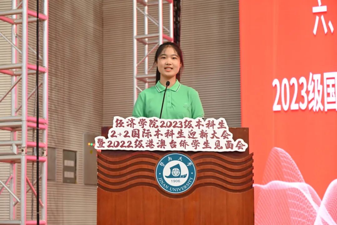 2023级国际经济与贸易专业的朱卓然同学作为2023级新生代表发言。从内蒙古来到花城广州,迈入充满新奇与美好的暨南园,作为经院大家庭中的新成员,她满怀激情地诉说着对大学生活的憧憬,并与全体新生共勉:“牢记师长谆谆教导,踔厉奋发,笃行不怠,在暨南经院的培育下奔赴属于我们每个人的星海。”