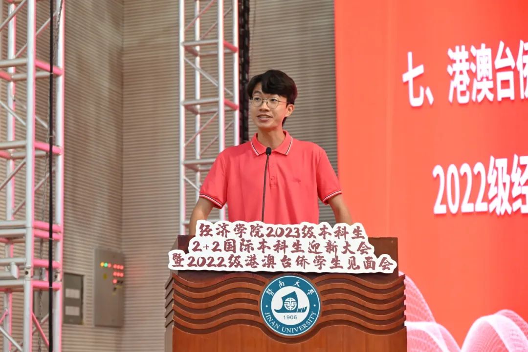 来自中国香港的2022级经济学专业陈逸勤同学作为港澳台侨学生代表发言。他回忆了过去一年,在四海书院学思想、强信念、悟文化的丰富生活,并呼吁全体2022级外招学子尽快调整,适应学院的培养模式,尽全力,展所能,用实际行动传承暨南精神,为粤港澳大湾区和国家发展贡献青年力量。